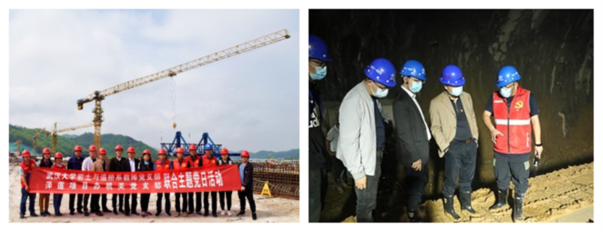 党史学习教育结束后,大家走进萍莲高速建设工地,登上50多米高的钟家里大桥,听取A3标项目经理介绍大桥建设情况;与A5标项目经理、总工一同进入莲花隧道出口处右洞,了解掘进施工近况。岩土与道桥系党支部书记张晓平教授介绍了学院的基本情况,解答了施工单位提出的大变形软弱围岩处治的相关技术问题,卢海峰副主任、万臻副主任为项目管理、监理、设计、检测、施工等人员介绍了岩土、桥梁两个学科方向的研究最新进展,并进行了充分的技术交流。