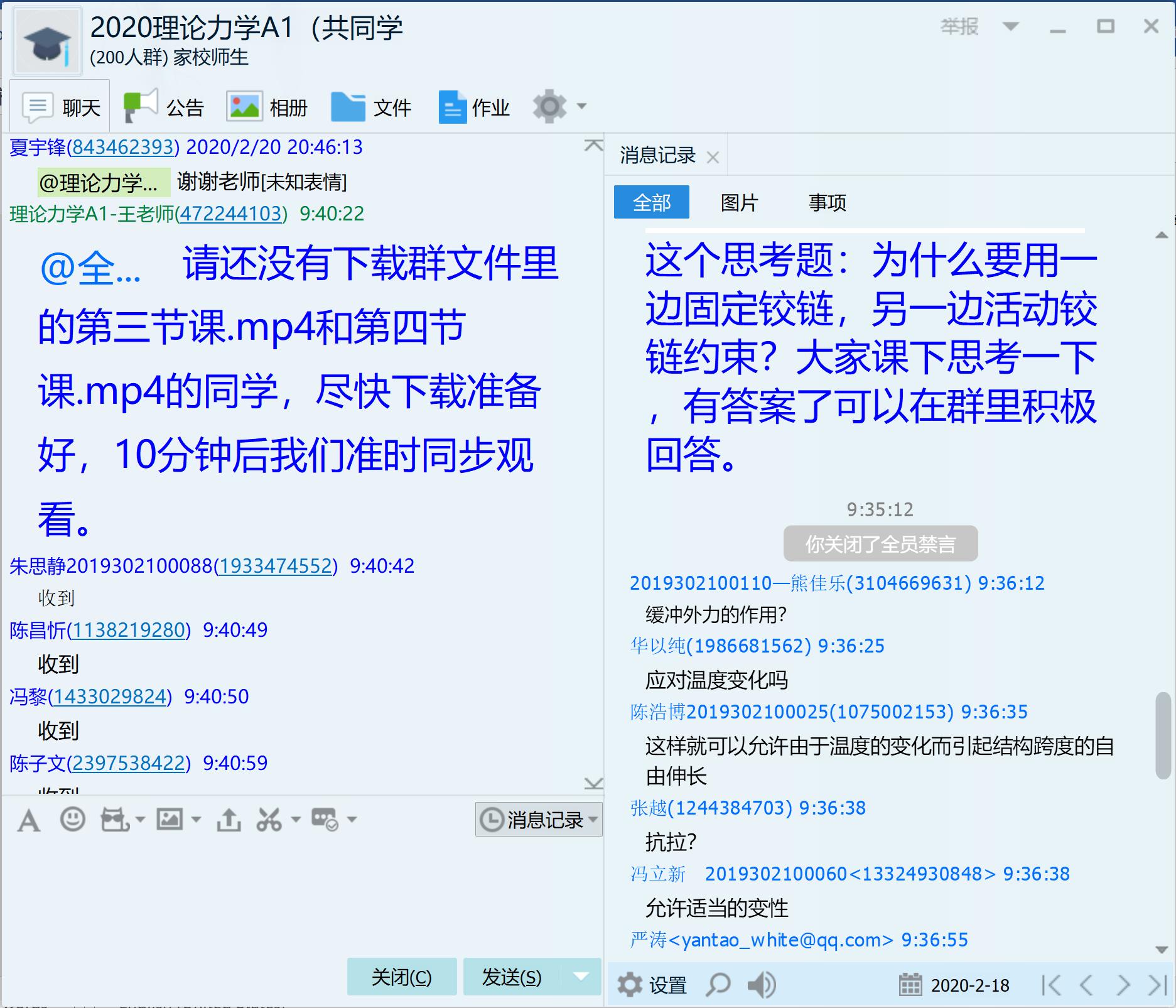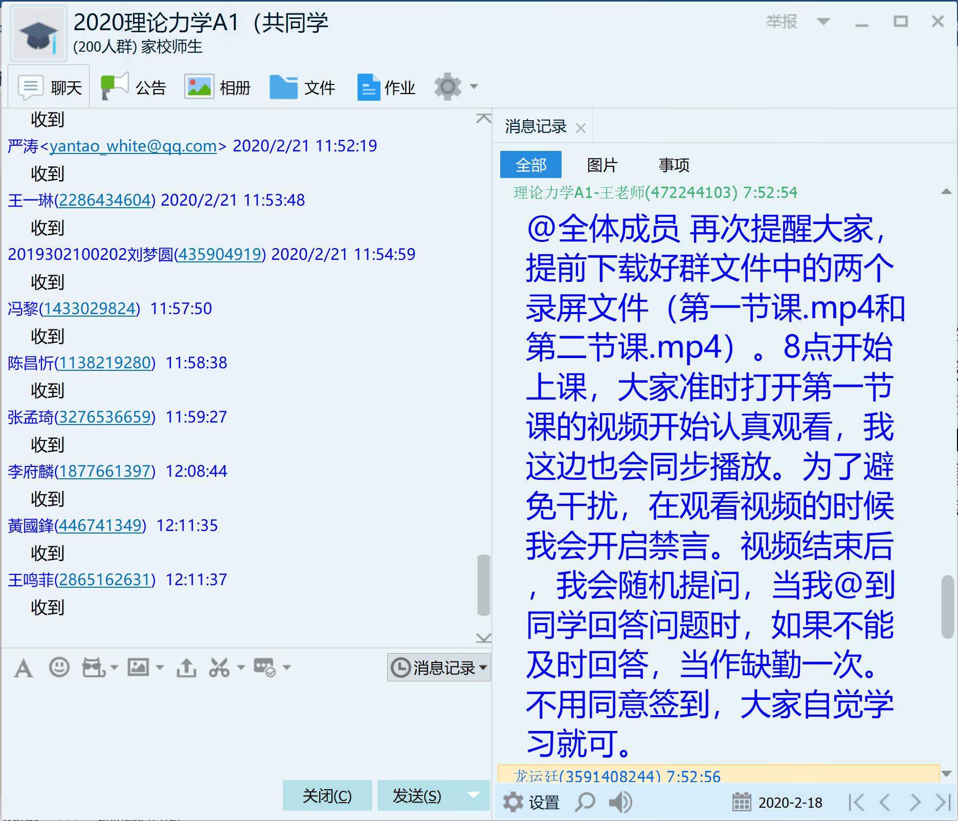 由于本人身处外地农村,网络条件不好,在疫情期间只能通过QQ群和微信群与学生们保持联系,完成基本的教学与科研指导工作。在教学方面,我会在每一节课之前提前录制好课件PPT的讲解视频,在自己反复观看确认无误后,将视频文件压缩并在上课前一天上传至群文件,让学生们提前下载好。在上课时间,我会让大家准时同步观看讲解视频。在这一过程中,我也会一同再次观看讲解,从学生的角度去思考讲解中存在的不足和不清楚的地方,然后在视频学习结束后通过QQ群再对学生们实时解释和讨论。在讨论过程中,我会提出思考题并随机提问,以提高群内讨论的气氛。