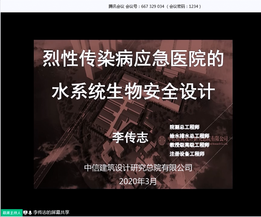接下来,李总通过共享屏幕的方式,将自己汇报的内容呈现给会议直播间的各位老师和同学。他为大家来的报告题目是:《烈性传染病应急医院的水系统生物安全设计》,报告主要从火神山医院设计建设之初的背景、整个火神山医院的项目介绍和医院的水系统生物安全设计等三个方面展开;而其中的水系统生物安全设计主要讲述了给水系统生物安全设计、排水系统生物安全设计和污水与污染物处理等三方面内容。
